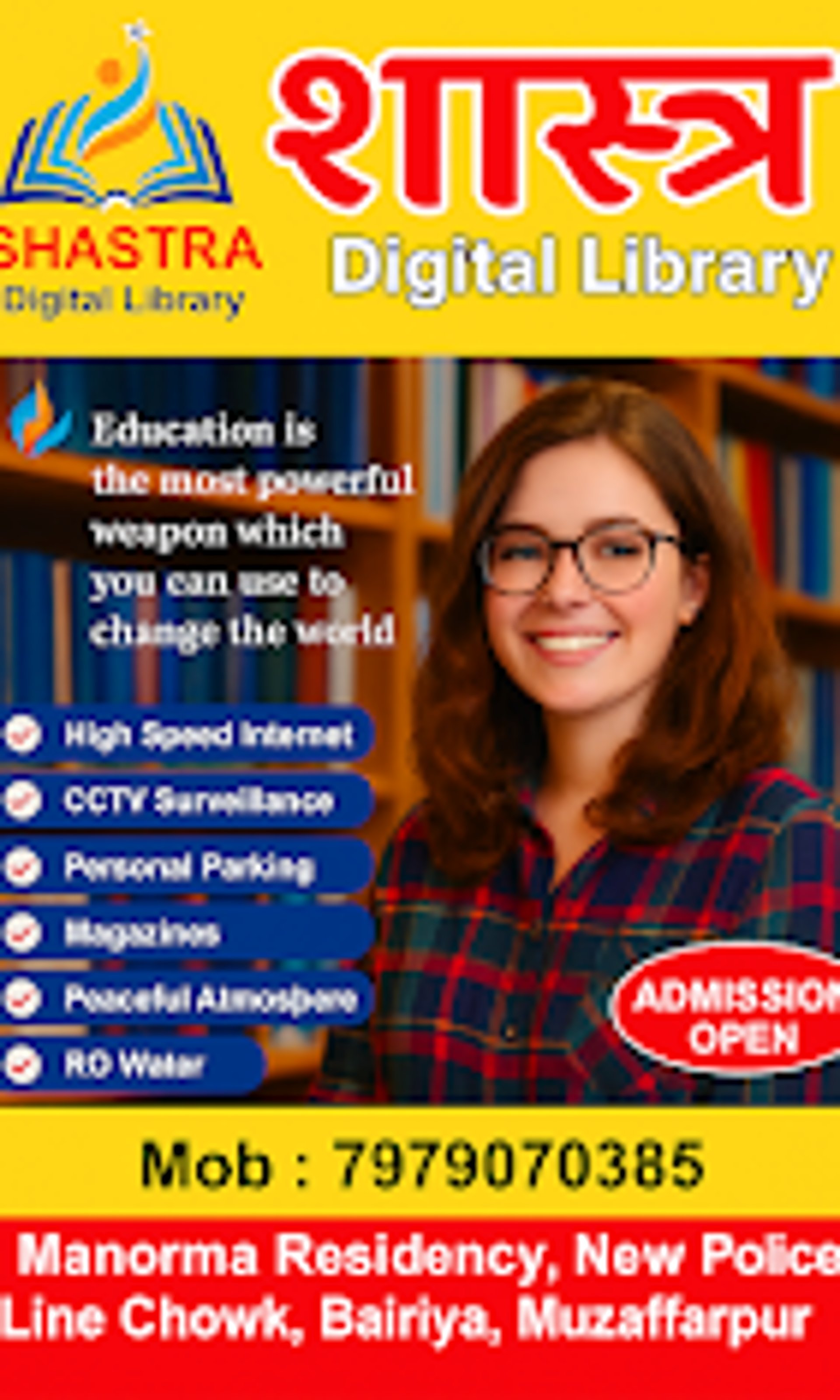 Shastra Digital Library is dedicated to supporting students and learners with a calm, air-conditioned environment, spacious seating, and 24/7 CCTV surveillance for a safe and productive study experience.